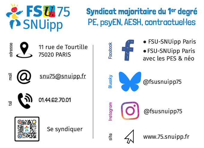 N’hésitez pas à imprimer, plastifier et afficher la fiche contact de la FSU-SNUipp Paris dans votre salle des maitre-sses ou à nous la demander par courrier !