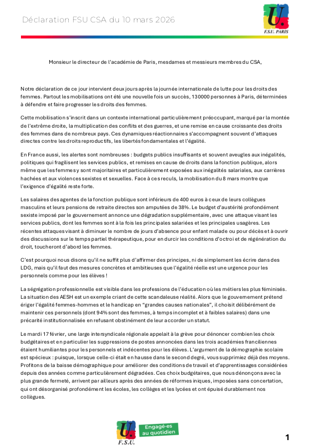 Cliquez sur l’image pour lire la déclaration liminaire de la FSU Paris en CSA le 10 mars 2026.