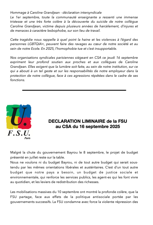 Le SNUipp et la FSU ont proposé aux autres syndicats de rendre hommage ensemble à Caroline Grandjean en début de CSA et ont dénoncé le manque de soutien à son égard, de notre institution. Ensuite, la FSU a dressé le bilan de la rentrée au sein de notre Académie et a dénoncé la politique austéritaire que veut imposer l’exécutif et le déni de démocratie que représente la nomination de Sébastien Lecornu comme premier ministre.
