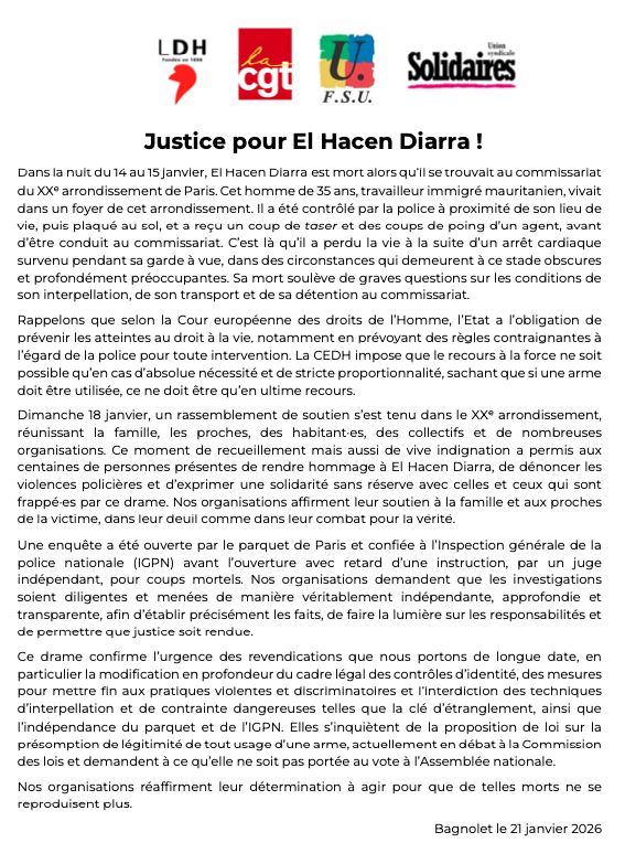 Dans la nuit du mercredi 14 au jeudi 15 janvier, El Hacen Diarra est décédé en garde à vue au sein du commissariat du 20ème arrondissement suite à son interpellation quelques heures avant devant le foyer de travailleur-euses migrant-es où résidait cet homme mauritanien de 35 ans. C’est là qu’il a perdu la vie à la suite d’un arrêt cardiaque survenu dans des circonstances qui demeurent à ce stade obscures et profondément préoccupantes. Comme le montre une vidéo, les circonstances de son arrestation sont manifestement violentes.