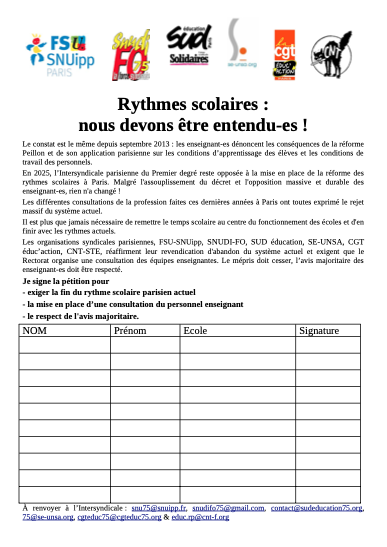 Les organisations syndicales parisiennes, FSU-SNUipp, SNUDI-FO, SUD éducation, SE-UNSA, CGT éduc’action, CNT-STE, réaffirment leur revendication d’abandon du système actuel et exigent que le Rectorat organise une consultation des équipes enseignantes. Le mépris doit cesser, l’avis majoritaire des enseignant-es doit être respecté.