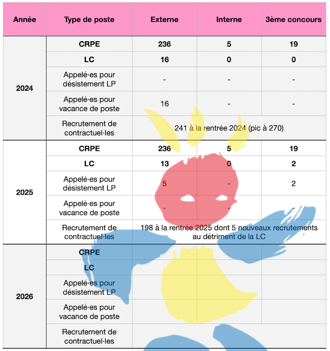 Jusqu’en 2020 à Paris, aucun recrutement sur LC ou de contractuel-les n’a eu lieu en cours d’année. Depuis septembre 2020 et la crise de remplaçant-es liée au Covid, l’Académie recrute des contractuel-les en cours d’année selon les besoins. Suite à la grève massive du 13 janvier 2022, des candidat-es de la liste complémentaire du CRPE 2021 ont été appelé-es en tant que PES le 25 janvier ainsi que des contractuel-les. Suite à la pénurie de candidat-es au CRPE 2022 (157 admis-es pour 219 postes), l’Académie a recruté près de 200 contractuel-les, la liste complémentaire étant inexistante.
